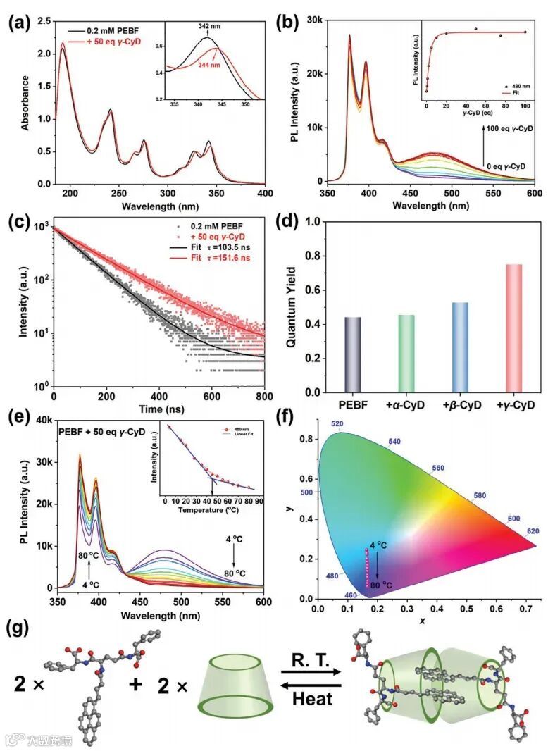 图6. 水凝胶中PEBF/𝛾-Cy D组装体的可调手性性质. a) CPL光谱. b) 320 nm激发下CPL不对称因子glum随波长的变化. c) 320 nm相同激发波长下2:1 PEBF/𝛾-CyD水凝胶的变温CPL光谱. d) 2:1 PEBF /𝛾-CyD凝胶的CPL循环实验.