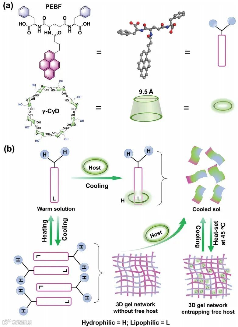 图1. a) 凝胶PEBF和𝛾-Cyd的结构示意图, b)通过可调的HLB主客体相互作用实现热致凝胶化示意图