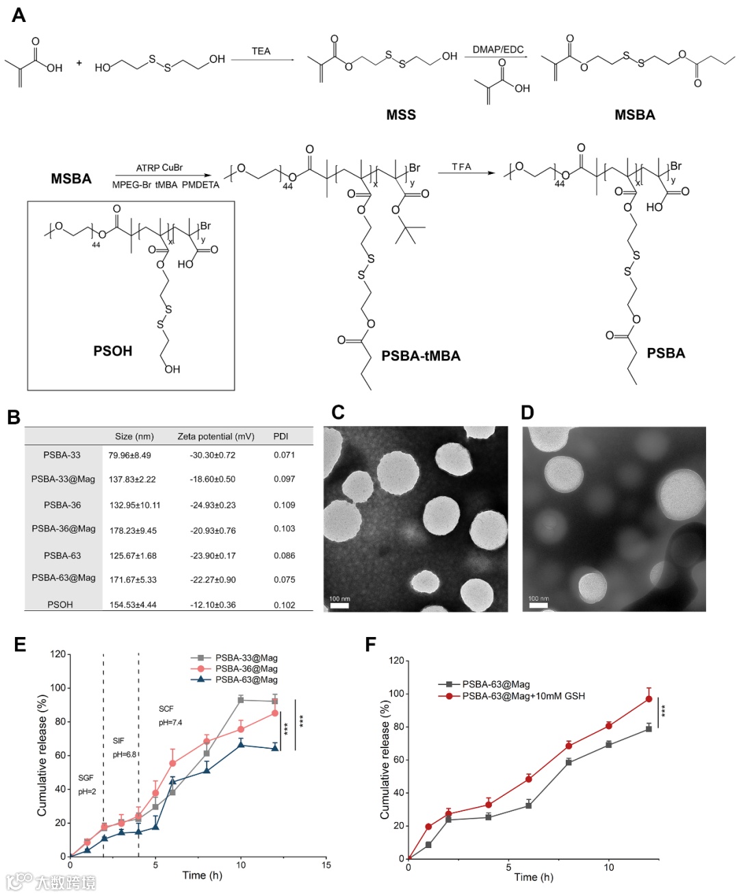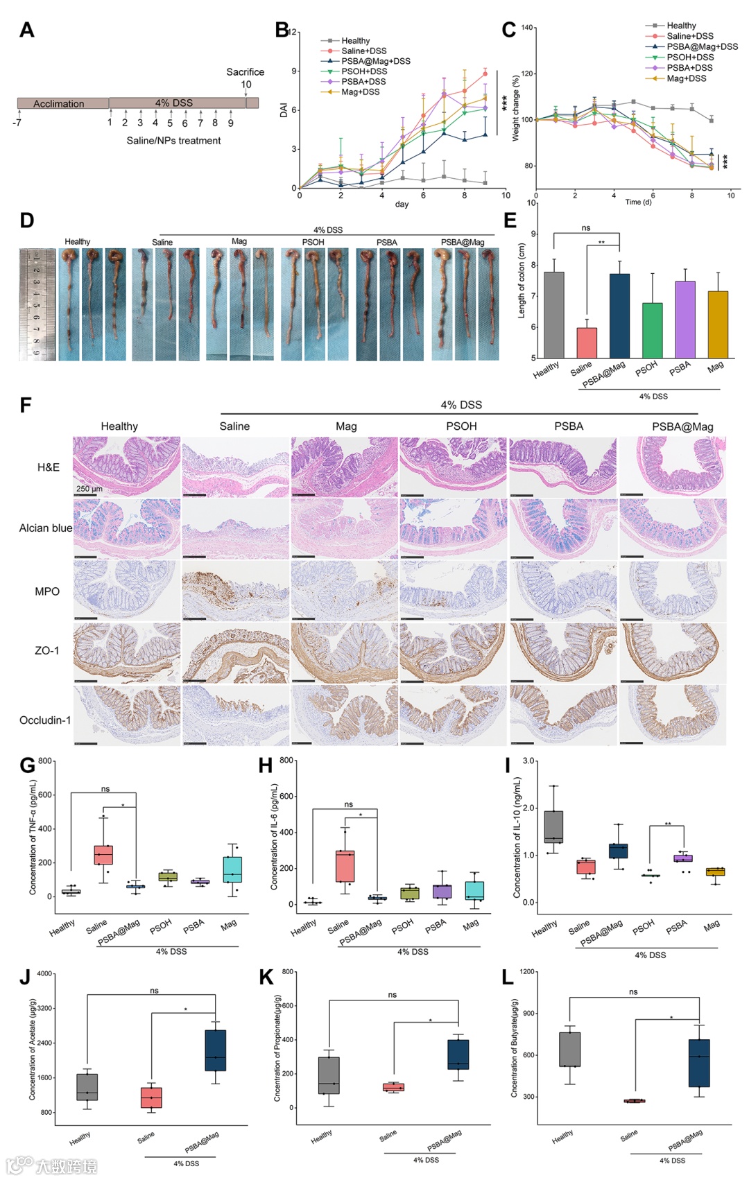 短链脂肪酸(包括乙酸、丙酸、丁酸等)是结肠益生菌的重要代谢产物。其中,丁酸不仅可以为肠上皮细胞提供能量,抑制NF-κB信号通路减少促炎因子分泌,还能有效促进和维持肠上皮屏障功能。IBD患者肠道菌群紊乱,丁酸含量降低,提高肠道内丁酸水平有助于恢复肠道稳态和调节菌群平衡。但是,丁酸小分子易挥发,味臭,直接口服易被上消化道快速吸收而不利于在结肠炎症部位聚集,生物利用度低。此外,天然中草药活性成分如多酚类化合物包括茶多酚、厚朴酚等,具有广泛的抗炎、抗菌等生活活性。例如,厚朴酚(Mag)是传统中药厚朴的主要活性成分之一,能够降低炎症部位活性氧水平,并通过影响MAPK和PPAR-γ等经典炎症信号通路来缓解炎症。然而这些天然活性成分水溶性低且易在胃酸等恶劣环境下降解,极大限制了体内治疗功效。基于前期在IBD治疗高分子药物载体系统的研究基础(Bioact. Mater. 2024, 33, 71-84;J. Control. Release 2023, 354, 1-18; Biomacromolecules 2023, 24 (5), 2250-2263; Int. J. Pharm. 2023, 639, 122962; J. Mater. Chem. B 2021, 9, 3874-3884.),四川大学何斌研究员/蒲雨吉副研究员团队构建了一种具有结肠pH和氧化还原响应的丁酸高分子化载体,其聚合物骨架为仿尤特奇肠溶衣的聚甲基丙烯酸衍生物,分别通过共价键接合物理包封的方式有效负载丁酸和厚朴酚,载药量分别约为22%和10%。经口服后,高分子纳米药物可在胃酸环境下保持稳定,而在肠道pH和高还原微环境条件下亲水性增加并断裂二硫键,暴露出具有生物粘附性的巯基官能团,增加结肠粘附和滞留,同时有效释放丁酸与厚朴酚,缓解肠炎。研究者首先利用ATRP聚合反应合成了一系列具有pH和氧化还原双响应性富含丁酸的聚甲基丙烯酸衍生聚合物,选取具有优良载药和释药行为纳米药物PSBA@Mag,系统研究了纳米药物在体外抗氧化抗炎与促上皮细胞迁移功能,在两种化学诱导IBD疾病模型中取得了良好的联合治疗效果,并通过转录代谢等组学研究揭示治疗原理。