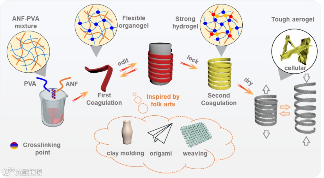 鉴于此,中国科学院苏州纳米所张学同团队受民间艺术(陶艺、折纸、编织)启发,建立了一种高效的两次凝胶化(TC)策略,实现构型可编辑高强度气凝胶的制备。作为概念验证,选择芳纶纳米纤维(ANFs)和聚乙烯醇(PVA)作为气凝胶的主要成分,其中PVA在第一次凝胶化过程中形成弹性的构型可编辑凝胶网络,ANF在第二次凝胶化过程中形成构型锁定凝胶网络。TC策略保证了所制备的ANF-PVA (AP)气凝胶既具有高韧性,又具有构型编辑能力。所得特殊构型产物能够突破气凝胶的性能限制,大大拓展气凝胶的应用领域。(图1)