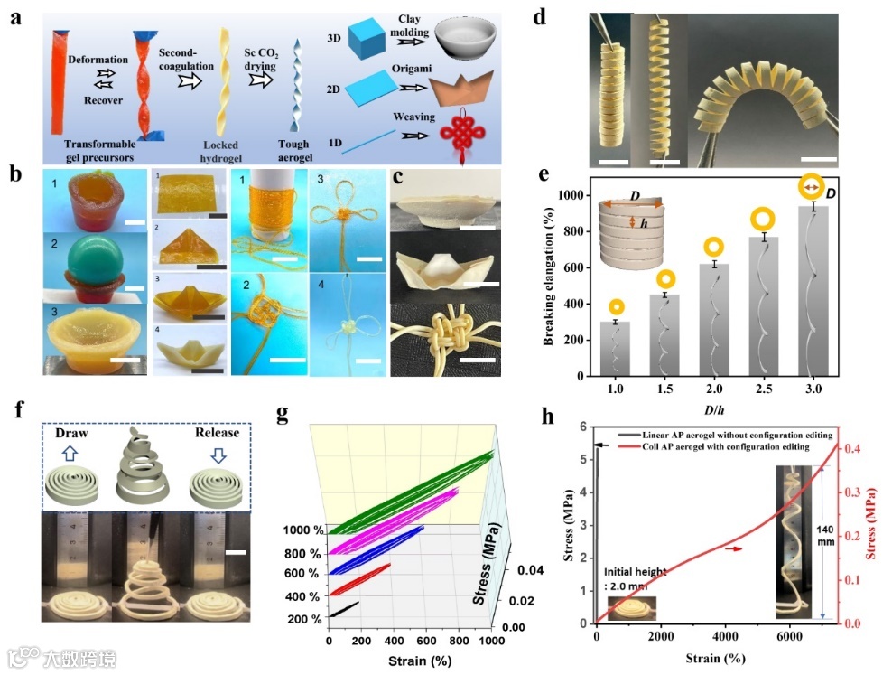 溶胶-凝胶过程和凝胶力学性能的有效调节为通过“软变硬”调制机制进行构型编辑、构型锁定和制造复杂构型的高强气凝胶奠定了基础。更具体地说,构型编辑基于有机凝胶的柔韧性,易于变形和恢复。构型锁定依赖于从有机凝胶到水凝胶的力学增强。最后,通过溶剂交换和超临界干燥,制备出具有复杂构型的高强度气凝胶。通过结构设计和参数调控,具有复杂构型的气凝胶能够突破其力学性能极限。例如,弹簧气凝胶可以自由变形,具有良好的拉伸、弯曲和扭转弹性。线圈气凝胶在1000%的拉伸应变下快速回弹,回弹率至少达到90%,其拉伸比可高达7000%,远远优于断裂伸长率只有25%的线形气凝胶。(图4)