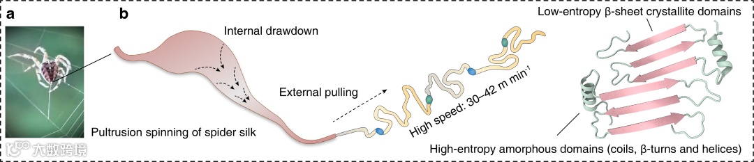 图1. 蜘蛛的挤拉纺丝策略与熵平衡的高阶纳米结构