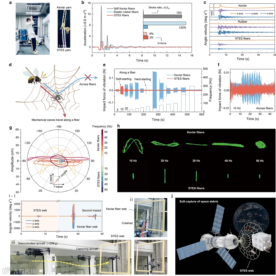 STES纤维展示出卓越的抗冲击、减震、吸能和阻尼性能。在自由下落测试中,连接着30克物体的80厘米长的STES纤维表现出极小的冲击力为2 G-force(0.54 N),而相比之下,Kevlar纤维的最大冲击力达到15 G-force(5.58 N),是STES纤维的10.3倍。考虑到人类最大可承受的8 G-force,Kevlar纤维产生的15 G-force可能会导致致命结果。而STES纤维的2 G-force搭配91.8%的吸能效率,使其能够实现类似软着陆的性能。虽然弹性纤维的最大冲击力仅为0.51 N,但需要更长的缓冲行程和时间以耗散能量。