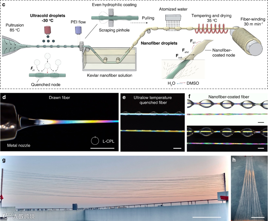 超冷液滴(-30°C)被用作分子尺度的力学雕刻工具,定制纤维内分子的缠结与结晶;而纳米纤维液滴则作为纳-微尺度的形貌雕刻工具,周期性定制纤维表面的强化结构。制备过程可分为以下几个步骤:首先,将熔融的EVA共聚物快速挤拉成丝,过程中采用超冷液滴进行周期性淬火。随后,在淬火后的纤维表面均匀涂布高粘度PEI水溶液层。接下来,PEI涂布的纤维快速浸入Kevlar纳米纤维的DMSO溶液中,并快速拉出,促使纤维表面生成纳米纤维液滴。最后,通过雾化清洗过量的DMSO溶剂,然后在低温下(35°C)对纤维进行干燥,从而得到最终的STES纤维。这种生产方式不仅省时而且不需要严苛条件,非常适合大规模工业生产。