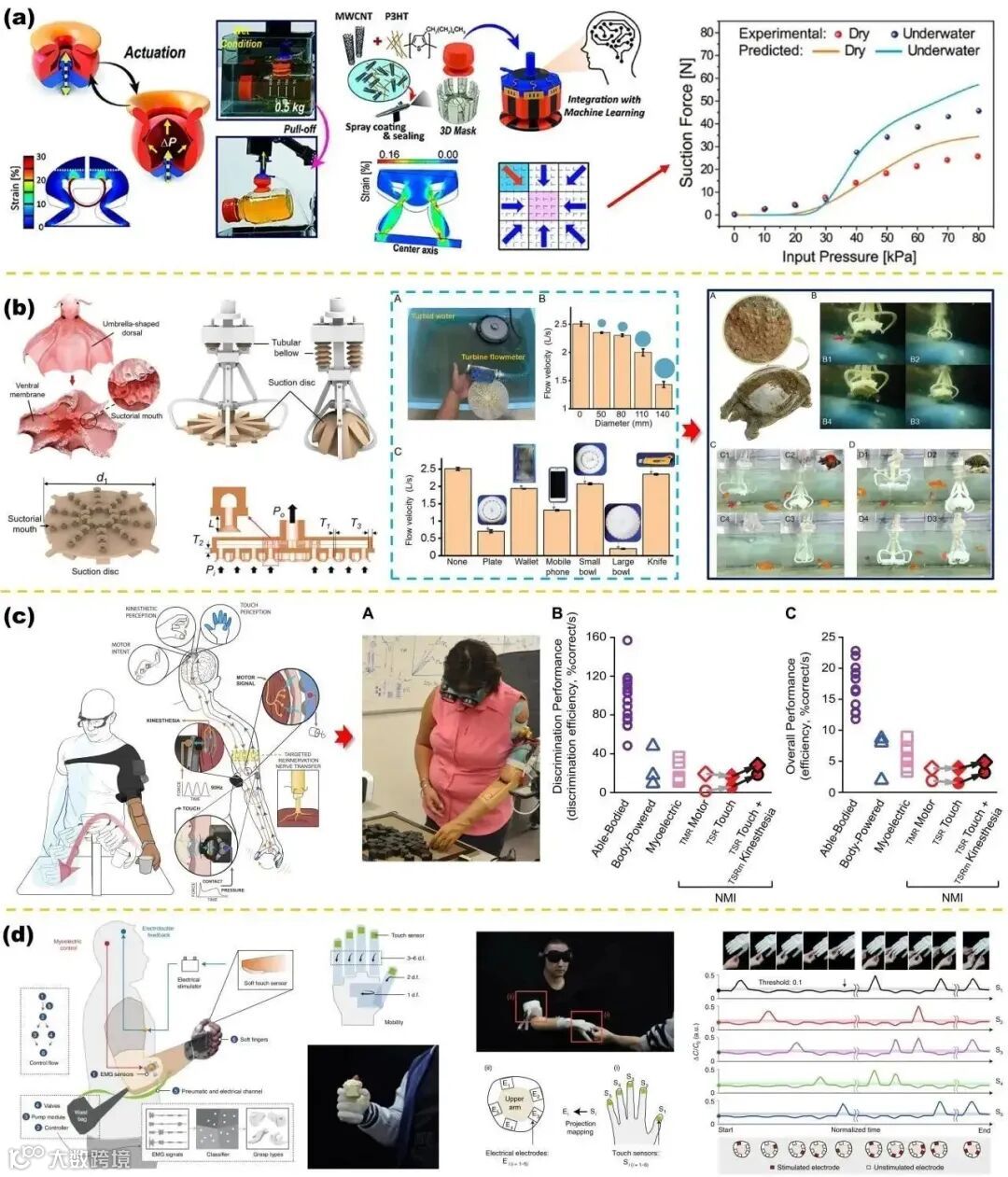 近年来,机器人和刚性机械手得到了广泛的应用,而软体机械手的出现,将任务操作的性能提高到了一个新的层面(如图4)。作者分别从水下、医疗、农业、工业领域介绍了软体机械手的应用场景,如水下活体生物抓取、神经假肢、果蔬采摘与分类、货物搬运等。