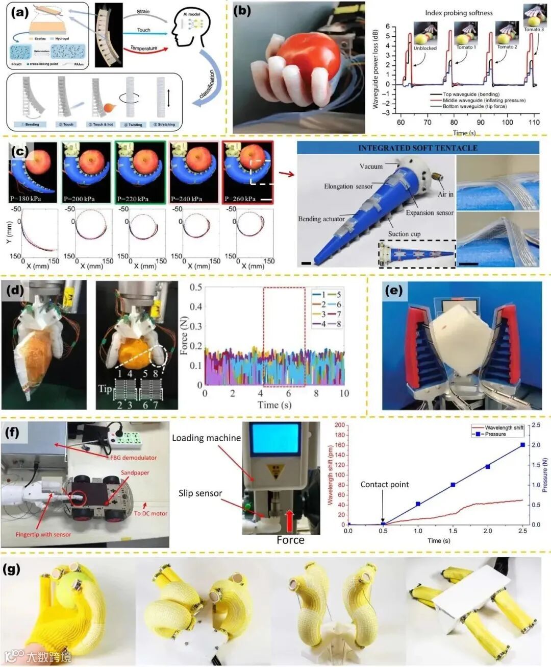 与传统的刚性机械手相比,软体机械手具有与非结构化环境交互更安全、变形能力更灵活的优点,为了增强智能感知能力,如图3所示,研究人员采用了大量的触觉传感器来获取抓取物体信息。作者分别从力感知、物体属性感知、滑动感知,以及融合感知四个方面分别探索了不同的触觉感知模态,分析并对比了用于软抓手触觉感知的典型机器学习方法。此外,作者还讨论了用于软抓手的触觉传感技术的特殊要求。