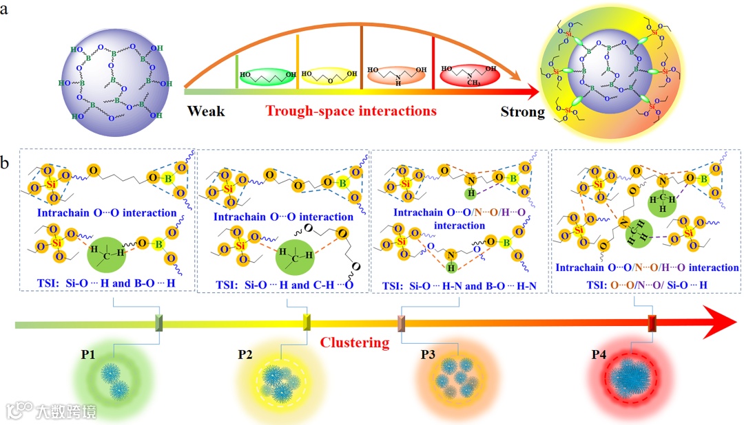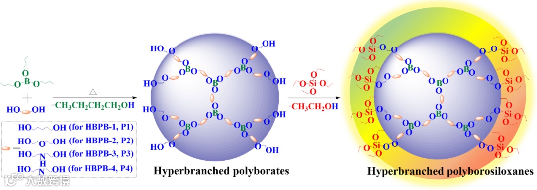 硼原子和硅原子的价电子结构为2s22p1和3s23p2,分别具有一个空的2p和3p轨道,使得含硅、硼杂原子的聚合物具有独特的光学性能。近期西北工业大学颜红侠教授团队与香港中文大学(深圳)唐本忠教授合作,以硅、硼原子构筑了一类具有红色长寿命的非传统荧光聚合物——超支化聚硼硅氧烷。作者利用硼酸三丁酯、不同电荷密度的二元醇以及正硅酸乙酯制备了一类的新型超支化聚硼硅氧烷(P1~P4)(图1)。发现随着反应单体二元醇电荷密度的增大,P1 ~ P4在乙醇溶液中的临界簇浓度(CCC)逐渐降低,分别为2.24、2.16、1.98和1.76 mg/mL;同时其发射波长随着电荷密度的增大也发生了明显红移,特别是P4在100 mg/mL的乙醇溶液中其最佳发射波长达到550nm(图2)。此外,还发现通过改变反应单体二元醇上电荷密度和聚合物的浓度,能够获得宽激发、宽发射范围,实现多色荧光发射。
