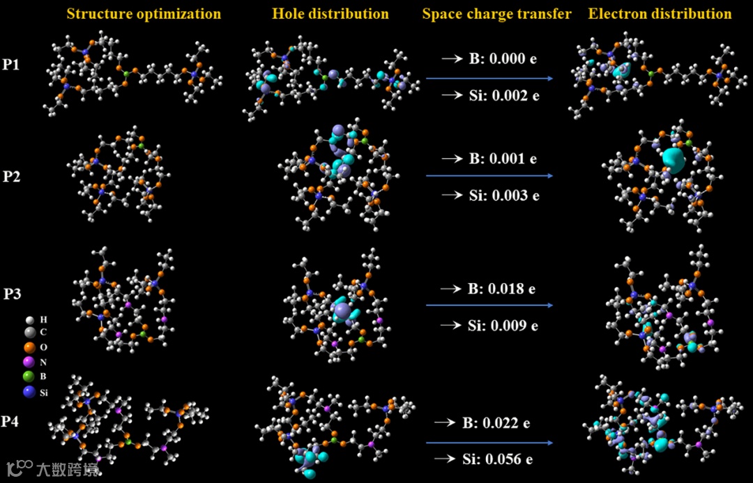 另外,作者利用含时密度泛函理论(TD-DFT)得到了P1~P4激发态空穴和电子密度分布情况。惊讶地发现,P4被激发后存在明显的电荷离域现象,同时叔胺上有0.022 e和0.056 e的电子分别转移到缺电子的Si和B空轨道上(图5),且存在较小的ΔEST=0.08 eV,该值小于0.1 eV(发生反系间窜越需要满足ΔEST<0.1 eV),有利于促进反系间窜越(RISC)过程从而延长P4的荧光寿命。此外,P4的溶剂变色效应也进一步证实了P4中存在分子内电荷转移。虽然,在P1、P2和P3中存在弱电荷转移,但由于缺乏强空间相互作用,导致荧光寿命仅为纳秒级。以上结果表明了激发态杂原子Si、B诱导的电荷离域效应以及基态下O···O、O···N的空间相互作用,二者之间的协同效应能够有效降低ΔEST,从而延长其荧光寿命。基于此,提出双重杂原子诱导电荷离域和空间n···n相互作用协同促进红色延迟荧光发射的新机制。