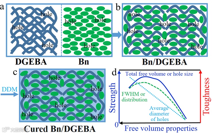 本工作中,作者利用点击化学技术将酰亚胺结构引入环氧树脂中,制备了一系列拓扑结构可控的超支化聚酰亚胺环氧树脂(Bn)(图1),进一步将其引入复合商业化通用环氧树脂(DGEBA)中。研究发现,聚酰亚胺结构的引入可显著提升环氧树脂的机械性能和热性能,其中具有中等支化度和中等含量的Bn/DGEBA共聚物展现出了最优的力学性能。与纯的DGEBA相比,超支化聚酰亚胺环氧树脂能同时提高拉伸强度、断裂伸长率、弯曲强度、弯曲模量、冲击强度和韧性分别提高了73.7%,36.3%,28.0%,38.0%,44.6%,116.4% and 216.2%。进一步通过正电子湮没寿命谱学(PALS)详细研究了共聚物亚纳米级自由体积尺寸与分布对宏观机械性能的影响规律。结果发现,随着自由体积分数、自由体积孔尺寸和孔平均尺寸分布的降低,共聚物的强度和韧性呈现出了先增加后降低的变化趋势。在此基础上,作者提出了Bn与DGEBA的均相分子互穿增强增韧,认为“椭球形结构”的超支化聚合物具有较好的流动性和相容性,可以与线形的DGEBA链形成分子互穿,填充原有DGEBA链间的孔隙,实现自由体积孔尺寸的降低和致密化,从而协同提升树脂的强度和韧性(图2)。此外,该环氧树脂还展现出了相对温和的降解条件和较高的单体回收产率。该研究为环氧树脂的增强增韧机制提供了新的理解和认识,为高性能可降解环氧树脂的设计开发提供了新的方法与途径。