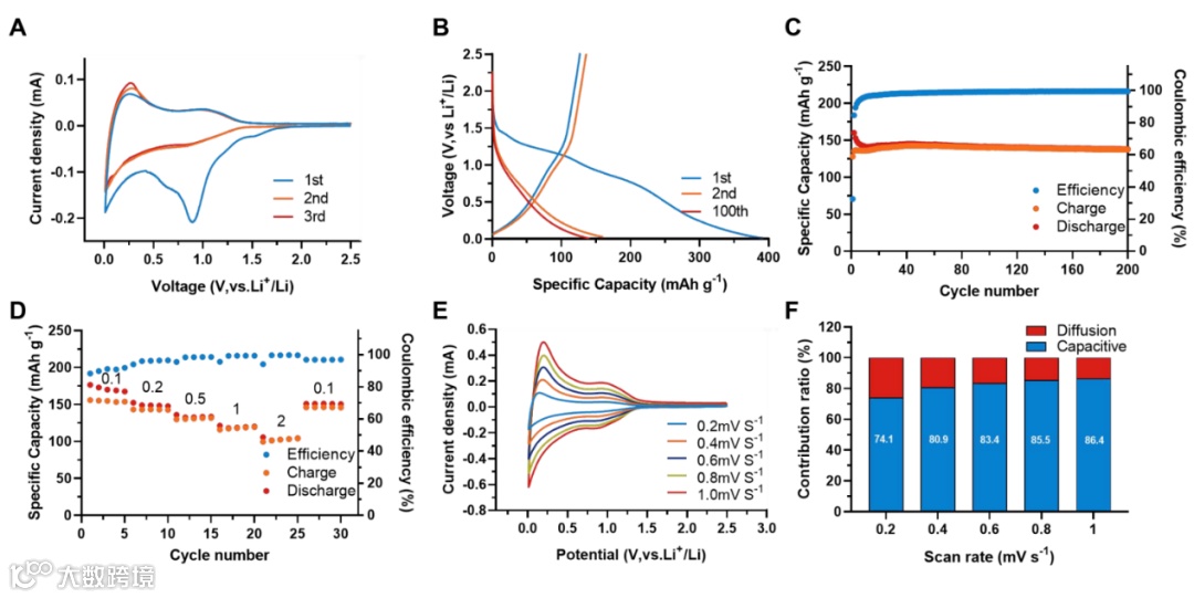 作者通过经济学分析(TEA)比较了离子交换法和一锅法生产CaTP的经济效益,结果显示一锅法生产CaTP在最小售价和年花费总额方面均具有优势。CaTP通过简单的方法纯化后用作锂电池的负极原料,其初始可逆比容量为164.2 mAh g-1,充放电100圈循环后的容量为136.3 mAh g-1(83%)。