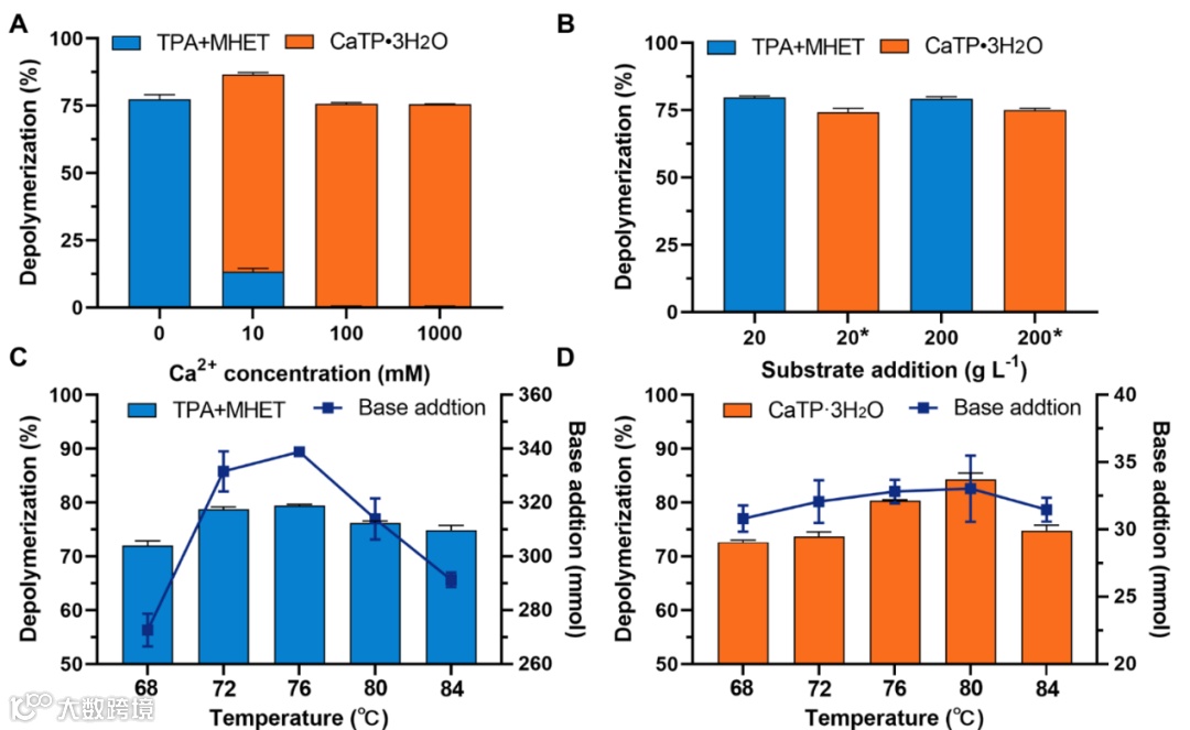 作者为了提高PET解聚过程中的CaTP产率,优化了包括温度、初始底物浓度和初始钙离子浓度的水解参数。并对CaTP的形貌、化学成分和热稳定性进行了表征。作者发现在高浓度钙离子添加的条件下,PET解聚产生的产物全部为CaTP,几乎没有可溶性对苯二甲酸盐产物。最优结果显示,通过添加1 M的Ca2+在80℃下反应12 h后成功地将~84%的废PET (200 g L-1)转化为对苯二甲酸钙水合物(CaTP•3H2O)。
