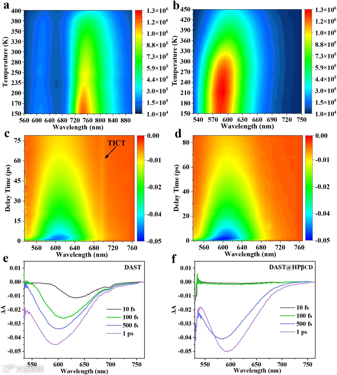 该研究通过低成本的静电纺丝技术实现高通量制备具有单/双/三光子吸收特性的大面积、柔性、透明的DAST@2-羟丙基环糊精(HPβCD)薄膜。研究发现通过交联HPβCD超分子网络,可以持久固定DAST分子的非中心对称排列结构,这使得DAST@HPβCD超分子薄膜无论在固态还是溶液状态下都具有优异的非线性光学(NLO)性能。由于HPβCD包合物有效的空间限域作用,限制了DAST分子的分子间运动,激发态主要被限制在LE态,而TICT等能量损失通道即使在严苛的条件下也能被有效抑制,因此DAST膜的发光性能提高了81倍,其PLQY达到了创纪录的73.5%。 DAST@HPβCD超分子薄膜可以在1064 nm的激发波长下实现高效的二次谐波产生(SHG),可在770 nm到1000 nm可调的激发波长范围下实现双光子激发荧光(2PEF),以及在1590 nm的激发波长下实现三光子激发荧光(3PEF)。同时,DAST@HPβCD超分子薄膜复合材料在环境空气中、水中浸泡或紫外/近红外光连续照射下均表现出良好的发光性能稳定性。例如,DAST@HPβCD膜的NLO特性可以在大气环境中保持超过470天,在水中浸泡超过4000小时仍然可保持良好。通过对DAST@HPβCD膜的热稳定性表征,他们发现DAST@HPβCD超分子薄膜可以在300℃加热时连续发光,可用于制造耐高温的发光二极管(LED),在10 W功率下可以连续超过20小时发射橙色光。