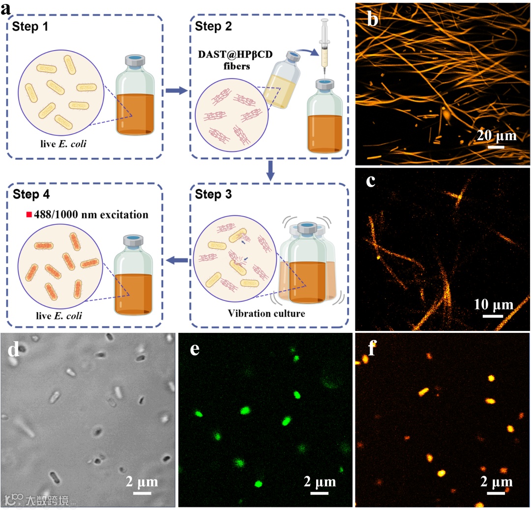 图5 利用DAST@HPβCD纤维对大肠杆菌进行体内生物成像的示意图和非侵入式单/双光子成像的显微镜图片