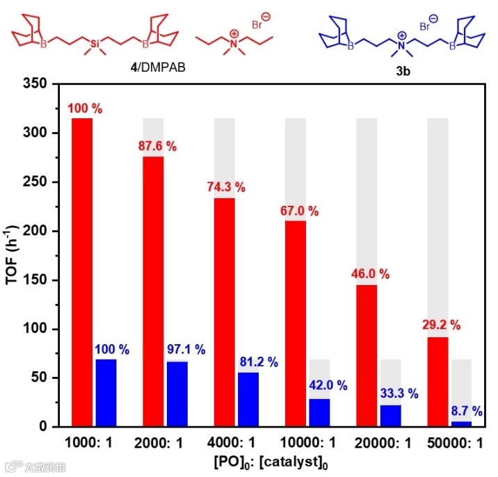 由路易斯酸主催化剂与亲核助催化剂结合组成的双组分催化体系(binary catalyst)已被广泛应用于环氧烷烃开环聚合、环氧烷烃/二氧化碳共聚、环氧烷烃/酸酐共聚反应,用于聚醚、聚碳酸酯、聚酯等多种聚合物的合成。然而,双组分催化体系存在一个显著的缺点:即在低催化剂负载条件下,由于熵增带来的稀释效应,导致其催化活性明显下降。这种稀释效应的根本原因在于,动力学上催化反应速率对双组份催化剂的两种组分浓度呈二级关系。与之相比,将路易斯酸和路易斯碱两个部分通过共价键整合到一个分子中,制备双功能催化剂(bifunctional catalyst),则可以有效降低催化剂的熵不利效应,保证低催化剂用量下的高反应活性。近年来,双功能的催化剂设计理念在席夫碱和卟啉等有机金属催化体系中(Acs Catal. 2022, 12, 11037−11070)和非金属的有机硼催化体系(Acc. Chem. Res. 2021, 54, 4434-4448)中都得到了广泛验证和应用。
