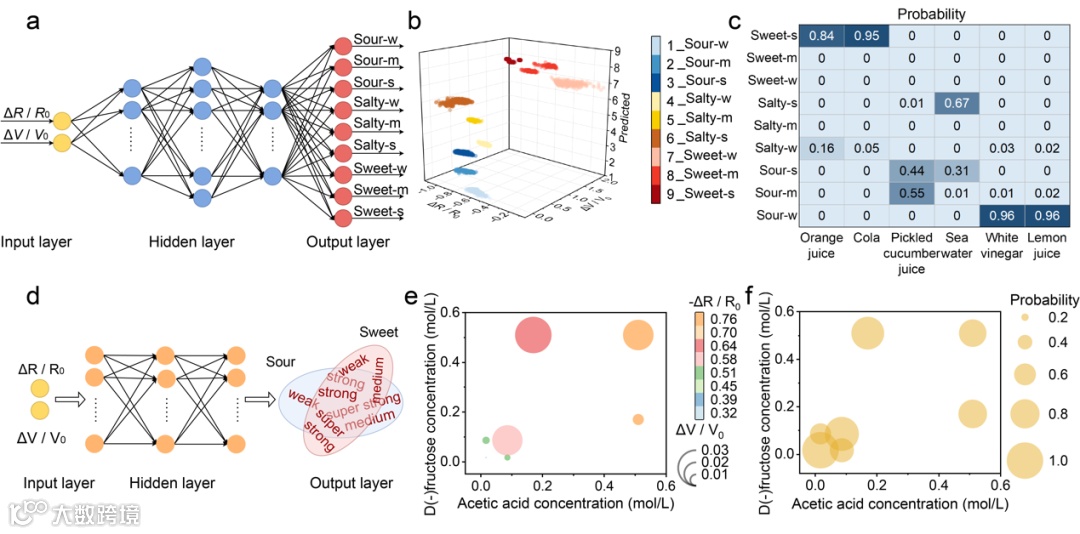 为了实现更具有应用前景的味觉分析,研究引入了机器学习方法(图5),采用深度神经网络(多层感知器)来处理电阻和体积响应数据,以识别和分类不同味觉物质的浓度。通过使用九个输出来表示不同味道的浓度,包括甜味、咸味和酸味的淡、中和强浓度,机器学习模型能够在限定数据集的情况下半定量地感知味道。这一方法可在实际食品中区分不同的味道,甚至能够识别混合味道,具有广泛前景。