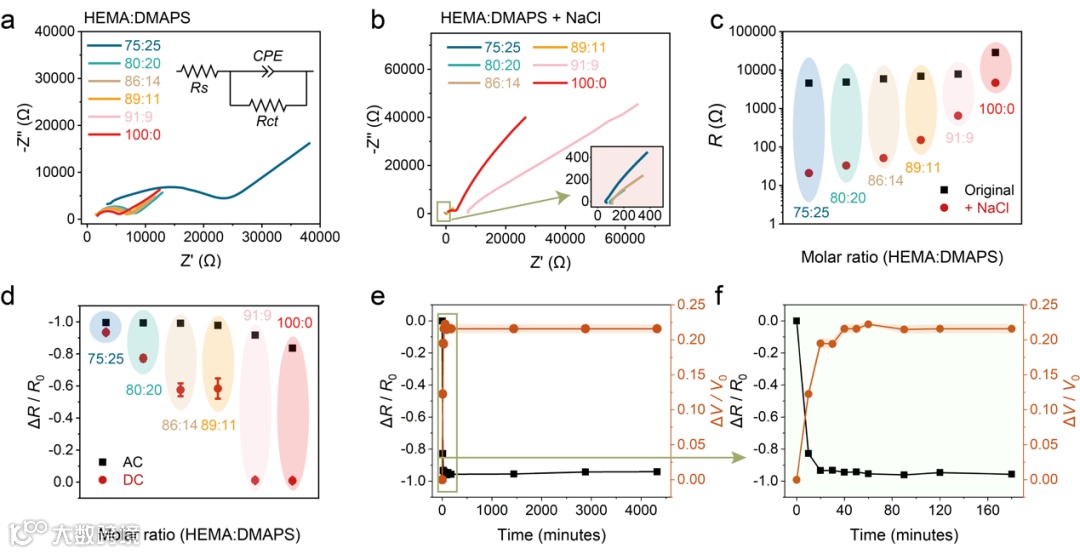 接下来,研究人员探讨了水凝胶在0.17 M 氯化钠水溶液中浸泡后的电学性能。电化学阻抗显示,在不同HEMA和DMAPS比例下,水凝胶的电阻均在浸泡过氯化钠溶液后呈降低趋势,尤其当DMAPS比例较高时,水凝胶的电阻变化更为明显(图3a,b,c),这表明DMAPS在容纳离子中发挥了重要作用。此外,通过监测水凝胶体积和电阻的瞬时变化(图3e,f)揭示了水凝胶味觉检测的动态稳定性。研究发现,在特定条件下,采用直流电场测量可以简化水凝胶的电学检测(图3d),为实际应用提供了更便捷的测量方式。