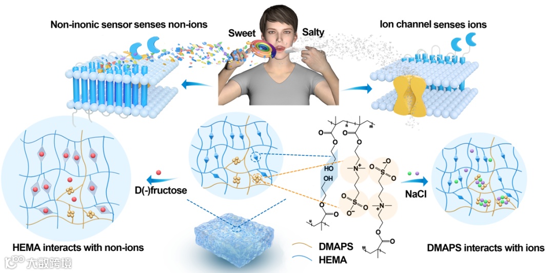 受味觉原理启发,阿尔托大学Olli Ikkala教授和复旦大学彭勃研究员提出通过电性和体积变化两种响应方式,使仿生水凝胶能够感知不同浓度的甜、咸和酸味。该水凝胶由非离子型单体2-羟乙基甲基丙烯酸酯(HEMA)和离子型单体N-(3-磺基丙基)-N-(甲基丙烯酰氧基乙基)-N,N-二甲基氨基甜菜碱(DMAPS)聚合而成,其识别方式模拟了味觉系统中的蛋白质受体蛋白和离子通道,两种单体分别与非离子性味觉物质(糖类)和离子性味觉物质(盐类和酸类)相互作用,从而实现对甜、咸和酸味的特异性识别。