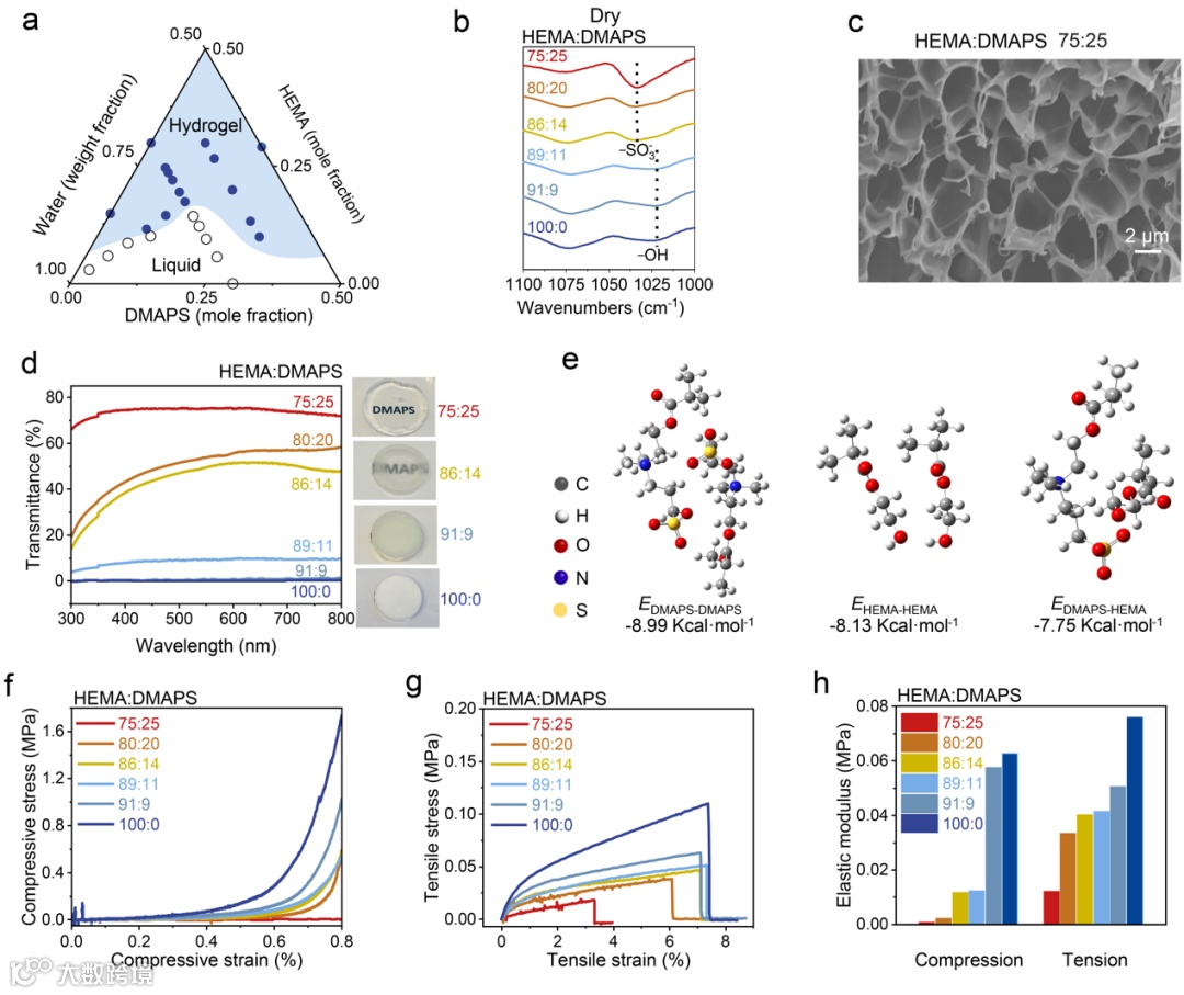 研究人员通过改变两种单体的摩尔比例来调控水凝胶的透明度和机械性能(图2a,b,c,d,f,g,h)。密度泛函理论模拟计算的分子间相互作用揭示了水凝胶合成的内部机理:HEMA更倾向与HEMA发生相互作用,从而引发单体聚集。DMAPS倾向于与水结合并增加光学透明度。图2e显示,DMAPS-DMAPS和HEMA-HEMA的结合能高于DMAPS-HEMA的结合能,表明水凝胶内部可能存在微观相分离。