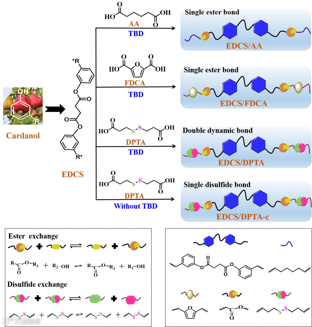 方案1. 腰果酚基环氧vititmer材料的合成路线和动态二硫键和动态酯键的交换机理。