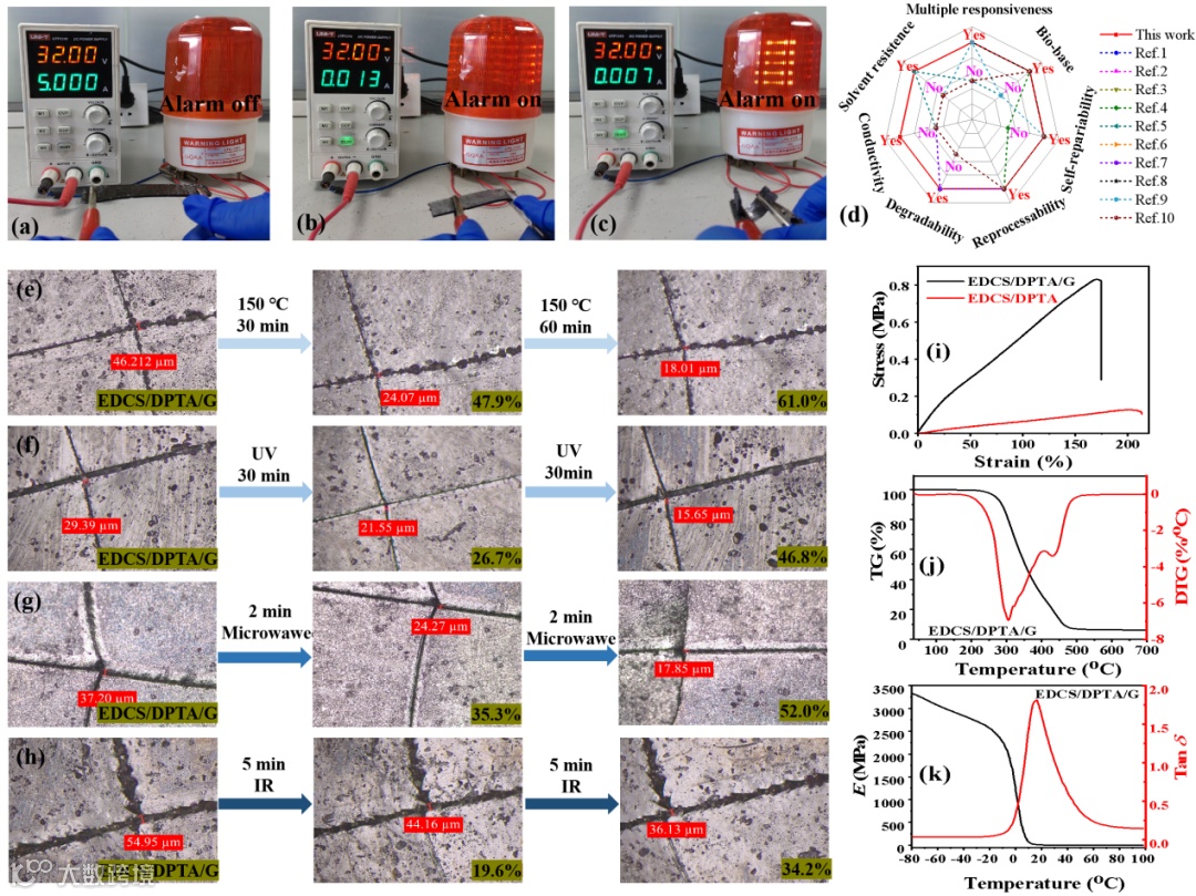 图5 (a-c) EDCS/DPTA/G的电导率;(d)本工作合成的生物基vitrimer和已报道的参数;(e) EDCS/DPTA/G在150℃下30min、60min的自修复能力;(f) EDCS/DPTA/G在UV作用下30min和60min的自修复能力;(g) EDCS/DPTA/ g在微波作用2和4 min时的自修复能力;(h) EDCS/DPTA/G在红外作用下5和10 min的自修复能力;(i) EDCS/DPTA/G的拉伸曲线;(j) EDCS/DPTA/G的TGA曲线;(k) EDCS/DPTA/G的DMA曲线。
