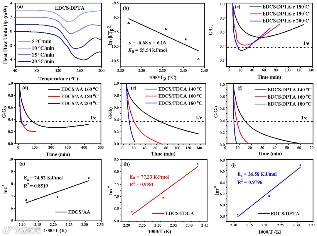 图2 (a) ECDS/DPTA的ln (β/Tp2)与1/Tp的DSC曲线和(b)线性图;(c) EDCS/DPTA-c的应力松弛曲线。(d) EDCS/AA的应力松弛曲线 (e) EDCS/FDCA的应力松弛曲线 (f) EDCS/DPTA的应力松弛曲线;(g) EDCS/AA, (h) EDCS/EDCA,和 (i) EDCS/DPTA的活化能。