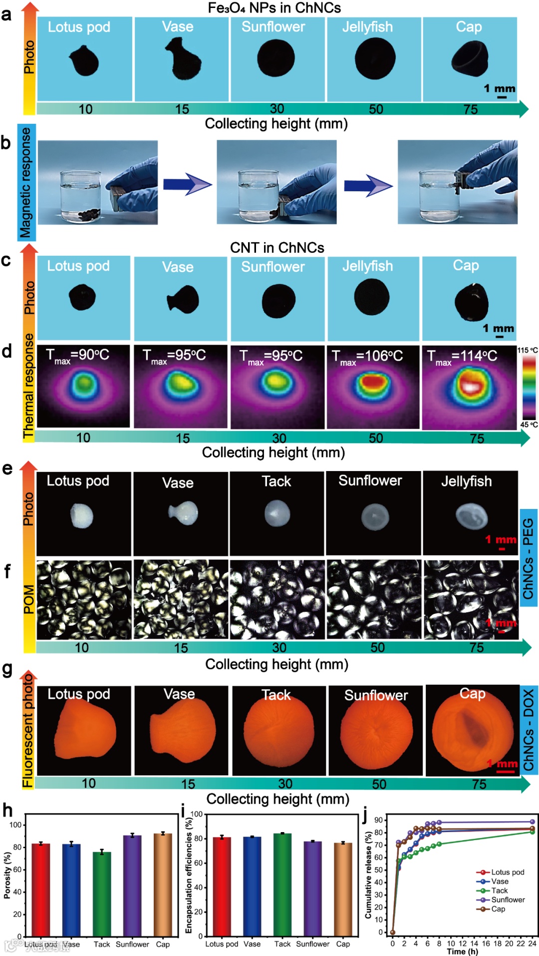 与球形颗粒相比,非球形物体具有更高的比表面积、更短的内部扩散路径和更好的变形能力。这些优点使得ChNCs液晶非球形物体在许多应用中非常受欢迎,例如显示、药物封装、递送、细胞培养、结构材料等。因此ChNCs液晶可以作为无机材料如Fe3O4纳米颗粒(图6a和b)和碳纳米管(图6c和d),有机大分子聚乙二醇(图6e和f),以及有机小分子阿霉素(图g-j)的模板。功能材料的加入,使ChNCs基复合非球形物体具有磁响应、光热转换、药物包封等功能。