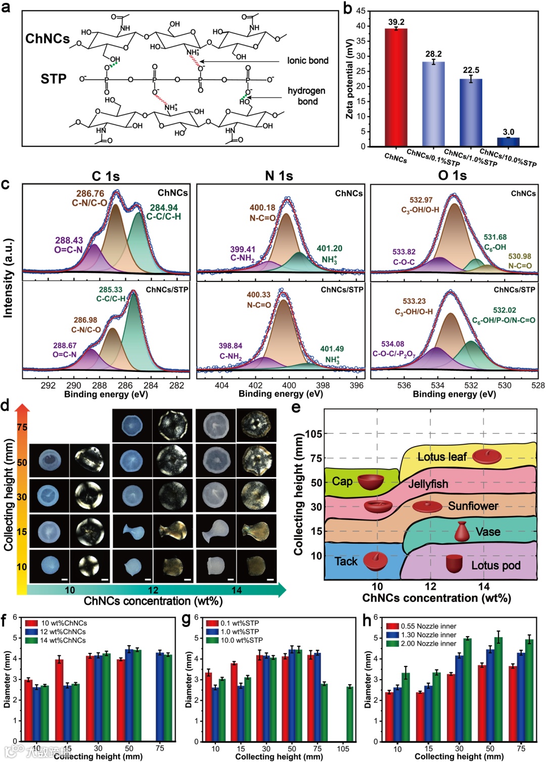 ChNCs和三聚磷酸钠(STP)间存在氢键和离子键,这两种作用力的协同作用可以加强ChNCs/STP中的分子内相互作用,从而获得稳定的ChNCs/STP复合物(图1a-c)。本研究通过简单的滴落撞击组装法,将ChNCs液晶滴落到STP凝固液中,获得了一系列具有丰富非球形状的物体,包括莲蓬,花瓶,大头钉,太阳花,水母,荷叶,帽子,羽毛球和草垛。在偏振光下,可观察到获得的非球形组装体具有马耳他十字现象(图1d和e)。通过调控收集高度,ChNCs液晶浓度和STP凝固液浓度可获得形状可控的非球形组装体。有趣的是,各种非球形物体的底部总是由不规则的半球组成,其直径取决于制备条件。随着收集高度的增加,非球形物体的直径先增加,后减小,并且在相同的收集高度下根据制备条件的不同而有所差异(图f-h)。