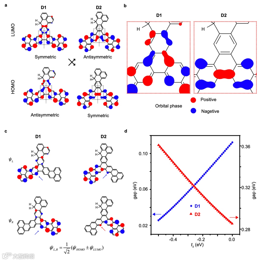 图4 D1、D2分子轨道对称性以及第三近邻相互作用的影响
