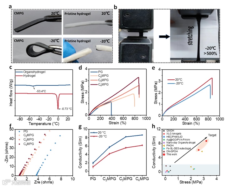 图2.有机水凝胶在低温下的力学性能和导电性。