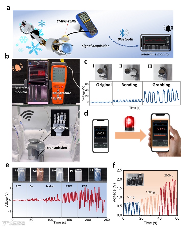 图3. 有机水凝胶基TENG自供电监测机器手低温工作状态的应用展示。