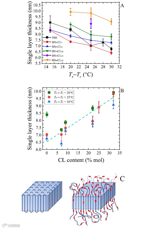 图3. 共聚物单晶单层厚度随共聚组成变化。A:随结晶温度变化;B:随共聚组成变化;C:均聚物单晶与共聚物单晶片层结构示意图。