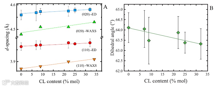 图4. 共聚物单晶晶胞参数随共聚组成的变化;A:晶面间距;B:(020)和(110)晶面二面角。