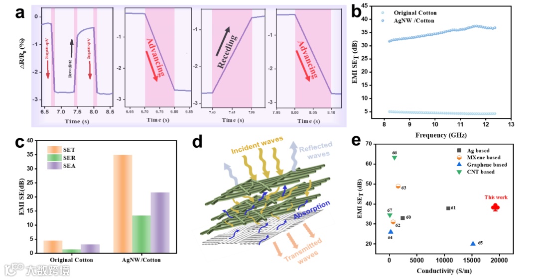 随着无线通信技术的快速发展和电子设备向小型化、高功率和高集成化发展,人们的生活越来越离不开电子设备。电磁干扰(EMI)问题对人类健康构成了严重威胁。AgNWs可以抑制电磁泄漏,保护电子设备免受磨损,在电磁屏蔽方面有更多的应用。因此,在纺织品中引入银纳米线(AgNWs)可以有效提高纺织品的EMI屏蔽效果。0.225 mm的AgNW/棉织物可以表现出≈38.2分贝的EMI SET,满足实际工业应用的要求(EMI SET>20分贝)。考虑到改性织物的厚度只有约0.225毫米,当复合两层或更多层的改性织物时,可以实现更高的EMI SET。其对电磁波的吸收(SEA)大于对电磁波的反射(SER),是一种基于吸收的EMI屏蔽机制。