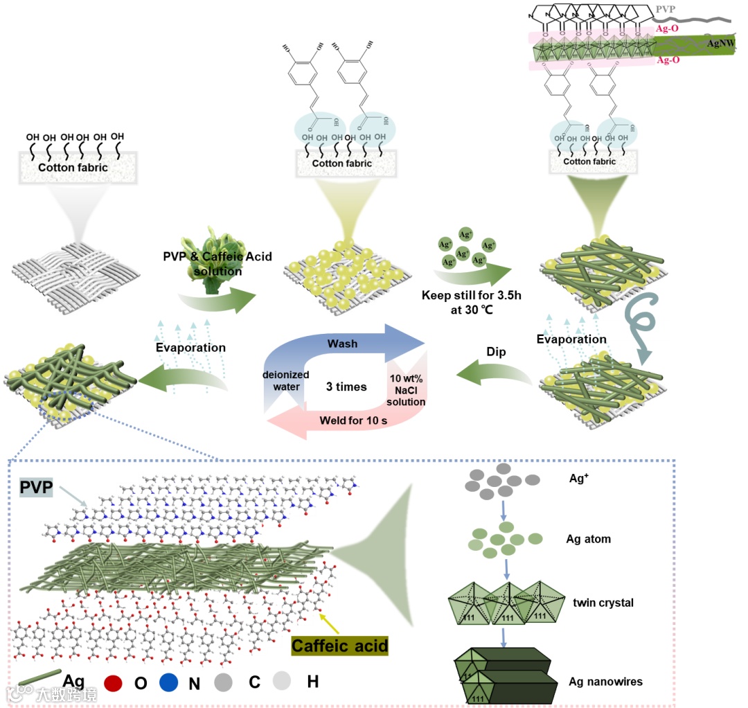 近日,苏州大学纺织与服装工程学院邢铁玲教授、陈国强教授团队以生物质咖啡酸为还原剂和锚定剂,以聚乙烯吡咯烷酮(PVP)为模板剂,室温下在棉织物表面原位生成直径为40~60nm、长度为40~60μm的高长径比AgNWs。所制备的柔性AgNW/棉织物方块电阻为0.23Ω/sq,具有优异稳定的导电性能以及良好的物理性能。此外,AgNW/棉织物在能量转换、压力/温度传感和电磁屏蔽等方面也表现出优秀的应用潜力,有望用于灵活、透气、多功能柔性可穿戴器件领域。
