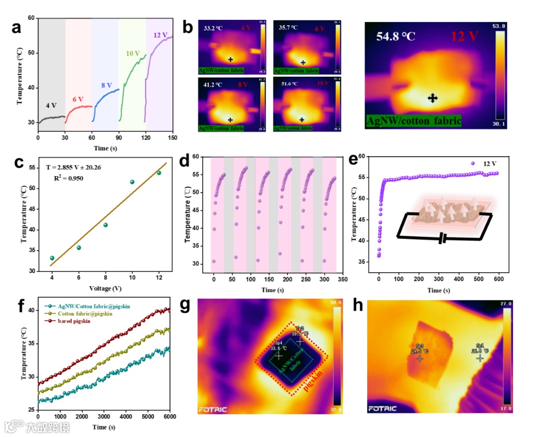 低电阻的AgNW/棉织物在给定电压下显示出优异的焦耳加热性能。AgNW/棉织物的表面温度可以在30秒内迅速达到稳定值。在12V电压下,AgNW/棉织物的表面温度从室温(≈29℃)迅速上升到54.8℃,位于41℃至77℃的合适治疗温度范围内,适合用于可穿戴式热疗保暖和缓解疼痛;AgNW/棉织物在六个电加热-冷却循环内表现出可重复的热反应,并能在近600秒的时间内保持极其稳定的表面温度,在实际热管理应用中具有出色的长期焦耳加热安全性。