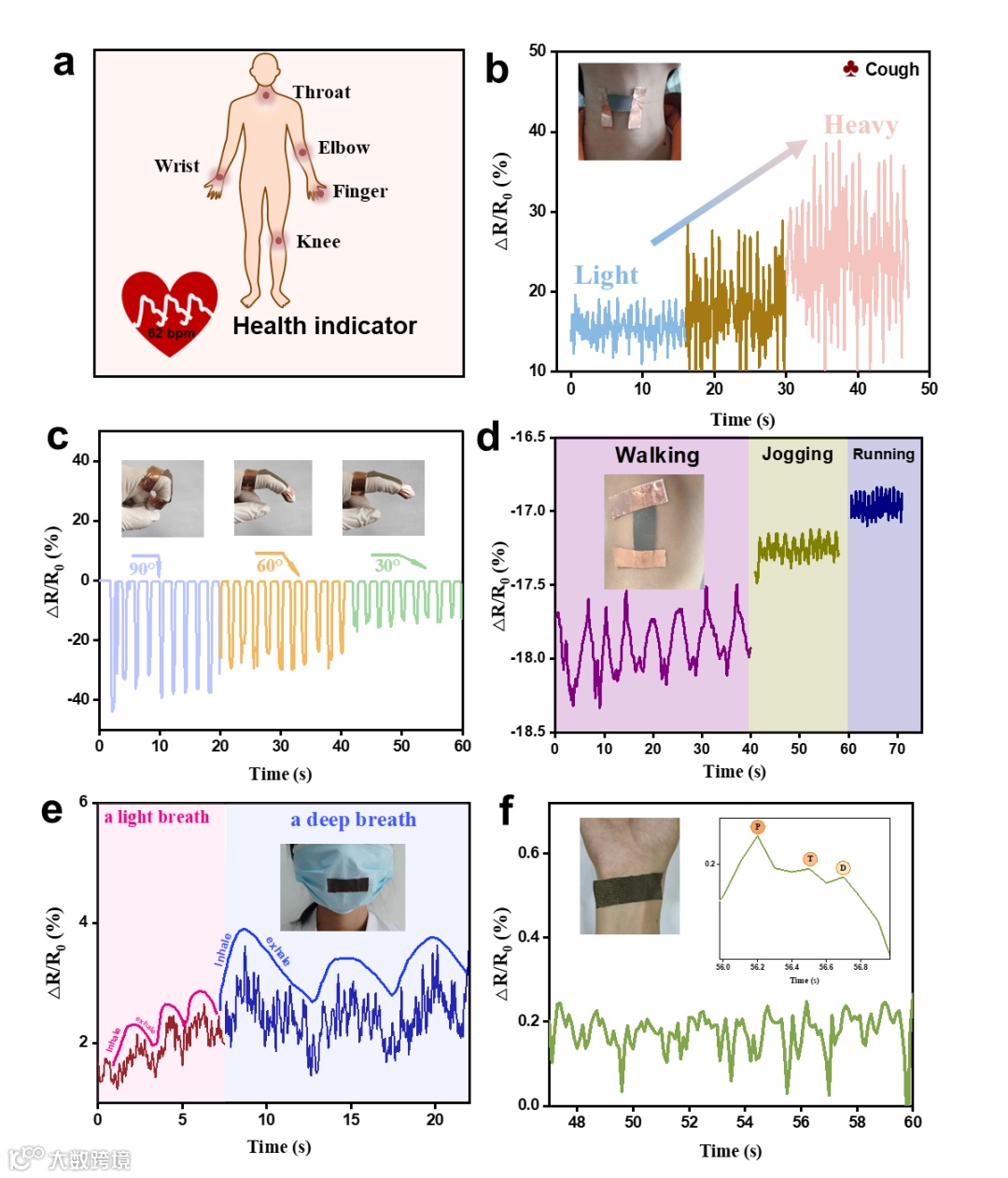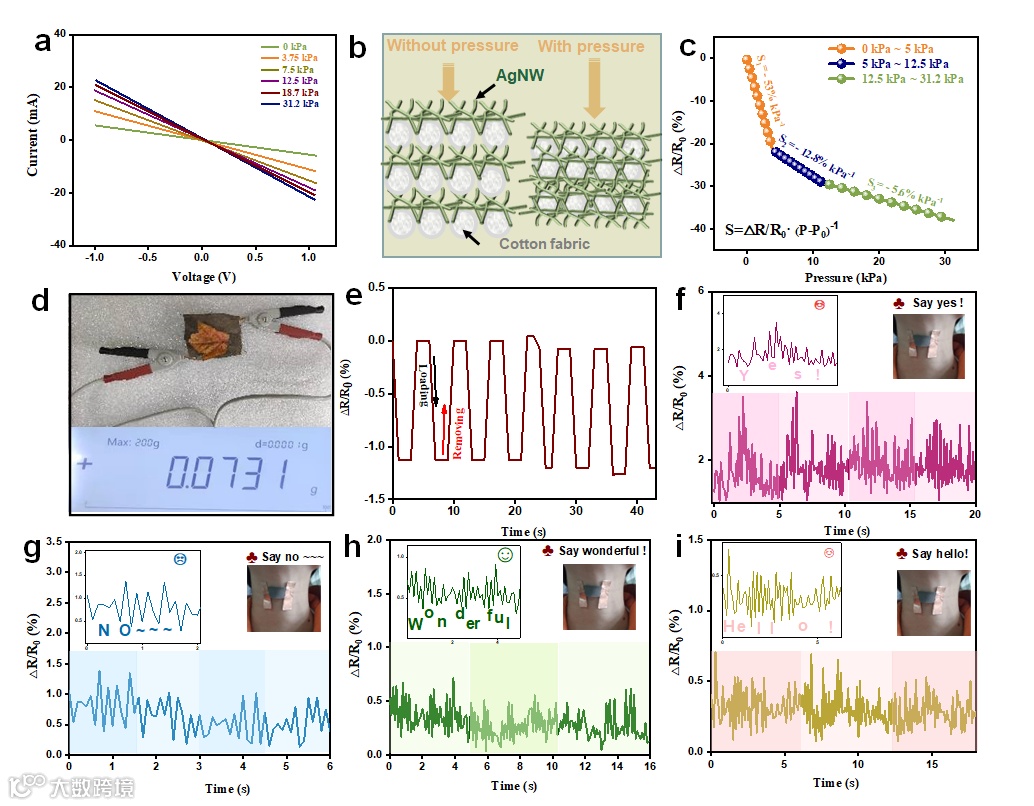 得益于稳健的导电网络,AgNW/棉织物表现出优异的压力传感性能。AgNW/棉织物压力传感器在不同压力下电流-电压(I-V)曲线的斜率随着施加的压力逐渐增大,并与压力的增加呈正相关,这意味着AgNW/棉织物压力传感器的电阻随着压力的增加而减小。AgNW/棉织物压力传感器的相对电阻变化与施加压力(0-31.2千帕)之间的关系曲线可分为三个区间。在0 - 5 kPa的外部压力下,传感器显示出S1= - 53% kPa-1的高灵敏度,这可以归因于棉纤维的微纳米多孔结构在外部压力下的轻微压缩和变形。在5 - 12.5 kPa的压力范围内,灵敏度约为S2= - 12.8% kPa-1,这得益于银纳米线相互之间或银纳米线与纤维之间在较高压力下的紧密结合,形成银纳米线高效导电网络。而在12.5-31.2kPa的外部压力下,灵敏度下降到-5.6% kPa-1。在这种压力下,稳健的银纳米线导电网络已经形成,所以只能观察到相对电阻的较小变化。AgNW/棉织物传感器具有很高的灵敏度,甚至可以检测到加载和卸载植物叶片(73.1毫克)引起的微小变化。当AgNW/棉织物传感器被贴在志愿者的喉咙、手指、手腕和膝盖等身体部位时,AgNW/棉织物传感器可以实时监测和反馈关节运动和生理信号(图5, 6),并显示出良好的响应性和可重复性。AgNW/棉织物传感器具有快速响应性、高灵敏度、低检测限以及优异的稳定性,将是柔性可穿戴设备领域中极具吸引力的候选产品。
