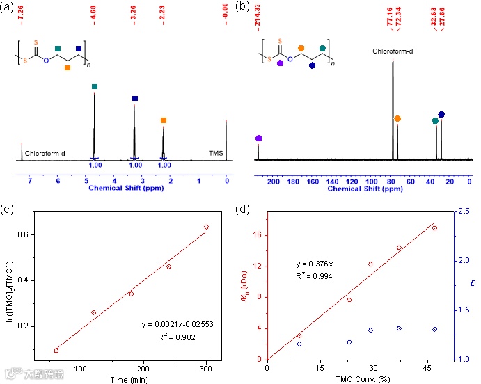 近期,浙江大学张成建副研究员和张兴宏教授在《Macromolecules》上发表了题为“Metal-Free Alternating Copolymerization of CS2 and Oxetane”的文章。该课题组利用烷基硼和鎓盐组简单混合的有机双组份催化体系,实现了CS2和氧杂环丁烷的交替共聚(图1),首次得到了交替共聚的聚二硫代碳酸酯(图2)。该共聚反应效率高,TOF为1103 h-1,没有小分子副产物生成。所得共聚物是结晶性的,熔点为83℃(图3a),拉伸强度为20.7±3.1MPa,断裂伸长率为480±20%(图3d)。泛函密度理论揭示了烷基硼活化氧杂环丁烷,并与增长链阴离子形成络合物从而实现交替链增长的机制。