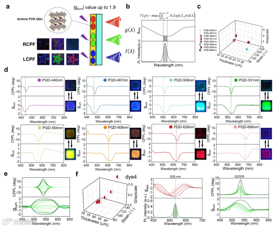 在此基础上,研究者合成了一系列不同发光波长的钙钛矿量子点,并通过机器化学家进行逆向设计,制备一系列具有超强光学活性的聚合物功能薄膜,通过精准调节薄膜CD光谱峰与量子点荧光波长的匹配,实现高的手性转换效率。如下图所示,研究者可实现复合薄膜圆偏振荧光峰位置、强度、信号正负的精准可调,不对称发光因子glum最高可达1.9,逼近理论极限。