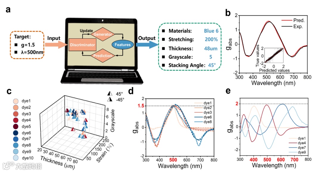 研究者从非手性聚合物出发,通过螺旋堆叠方法设计了具有超强光学活性的聚合物功能薄膜的构筑方案,基于该方案搭建了可供机器化学家操作的薄膜制备-表征实验平台(图1);从材料制备工艺参数、谱学特性出发,采用机器化学家精确控制薄膜制备参数、测量薄膜光学响应性质、进行高效实验采集约1500组数据,整合构建光学功能薄膜的光谱-性能数据库;以其为学习样本,基于理论计算数据和实测数据进行优化学习,训练神经网络构建基于材料的制备工艺参数、谱学特性和手性光学性能的耦合映射关系,实现端到端的手性光学材料性能的正向精准预测(图2)。