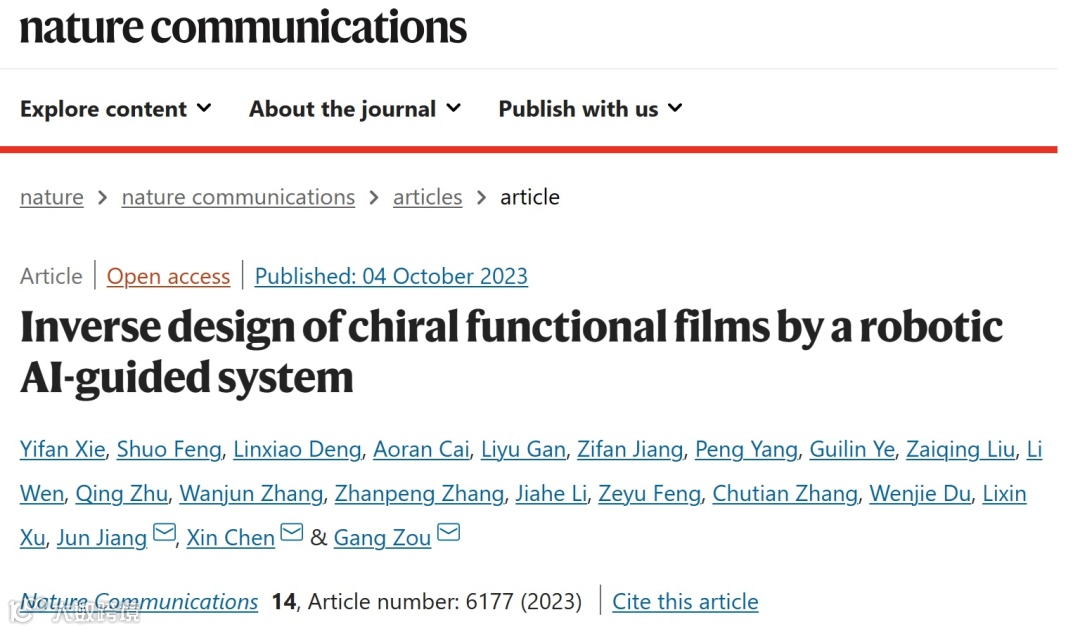 针对手性聚合物材料的设计难题,邹纲教授与江俊教授团队合作,通过数据智能驱动的全流程机器化学家,利用机器实验高效采集大量精准数据,结合人工智能方法分析实验数据,构建薄膜光谱特性、制备工艺参数和宏观手性光学功能之间的耦合映射关系,实现了手性光学活性的精准预测和按需定制的逆向设计。该研究为实现手性功能材料的逆向设计和定制制造提供了新的途径,也展现了机器化学家在材料智能创制中的强大能力。该成果以“Inverse design of chiral functional films by a robotic AI-guided system”为题发表在《Nature Communications》上。