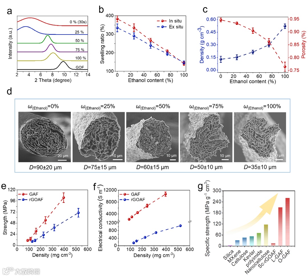 图3 调节塑化溶胀浴的组成,氧化石墨烯凝胶纤维的(a, b)溶胀率、(c)密度和孔隙率、(d)断面SEM图, 不同密度的还原氧化石墨烯气凝胶纤维和石墨烯气凝胶纤维的强度(e)、导电率(f),(g)不同材料的气凝胶纤维比强度的比较