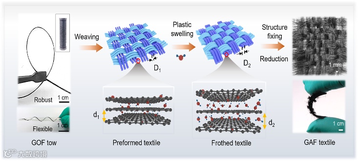 基于这一问题挑战,浙江大学高分子系许震研究员等基于预编织物的塑化溶胀法制备高性能石墨烯气凝胶纤维织物的方法,揭示了氧化石墨烯纤维塑化溶胀过程的取向优势,突破了石墨烯基高性能气凝胶纤维难以编织和规模应用的困境。相关成果以“Plastic-swelling Preparation of Functional Graphene Aerogel Fiber Textiles”为题发表于Advanced Fiber Materials。论文的第一作者为浙江大学硕士研究生齐玉祥和博士研究生夏雨星。
