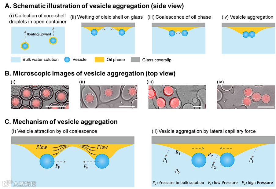 图二:毛细流驱动的脂质囊泡聚集机制。(A)示意图和(B)光学显微镜图像,显示脂质囊泡毛细流驱动的组装过程:(i)在开放容器中收集的核壳液滴;(ii)核壳液滴的溶剂壳润湿亲油盖玻片,油滴因此变形;(iii)相邻的核壳液滴相互接触并聚结;(iv)由于侧向毛细流吸引而导致的脂滴聚集。(C)两个油筏聚集示意图(i)在湿润的盖玻片上,相邻的两个油筏相互接触,它们之间形成油桥;(ii)通过毛细压力将两个油筏合并为一个,促进两个囊泡的聚集。