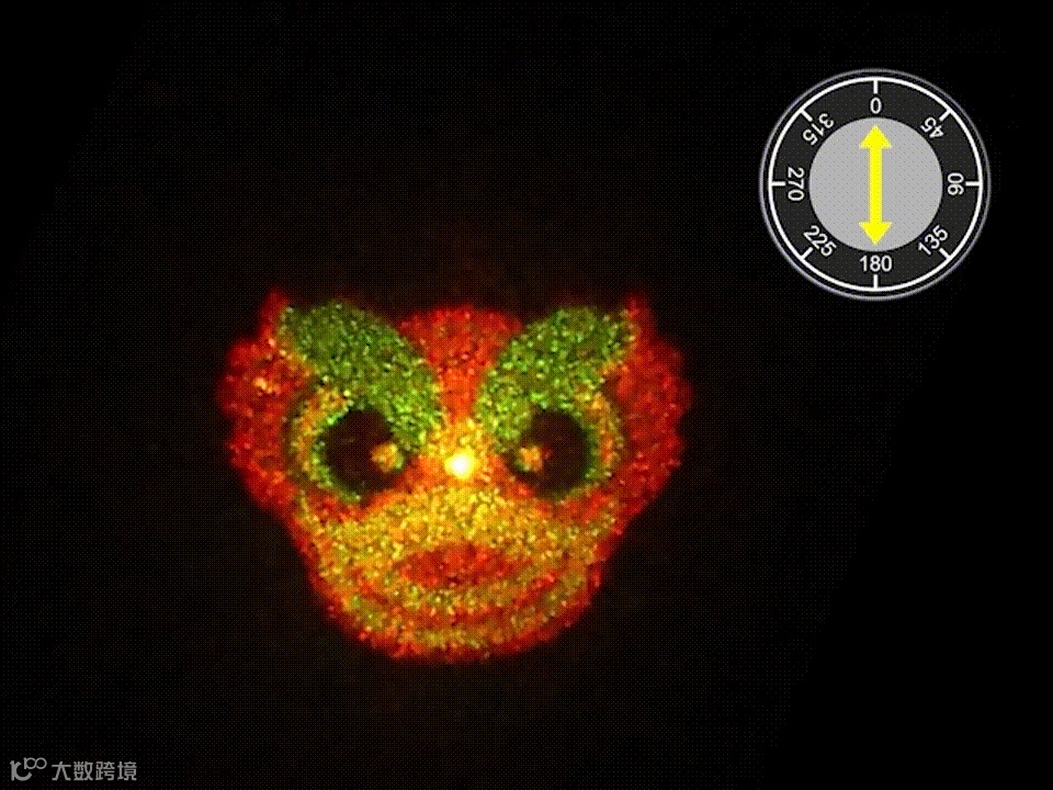 多色光入射双手性液晶超结构时,反射光的线偏振方向会随波长有规律地旋转,并在550~605 nm的波长范围内旋转了360°。该物理效应在反射光偏振方向和波长之间建立起一对多的映射关系,因此,固定的检偏片滤出的舞狮全息图像会随波长交替变化(图2g)。若同时入射多个波长的光,就可以混合出炫彩的舞狮全息图像(图3)。基于反射式旋光色散的动态可调性,偏振片旋转和外场刺激均能改变这些全息图像的颜色,实现“全息彩绘”的动态上色,充分验证了该方案在动态多色光复用方面的潜力。
