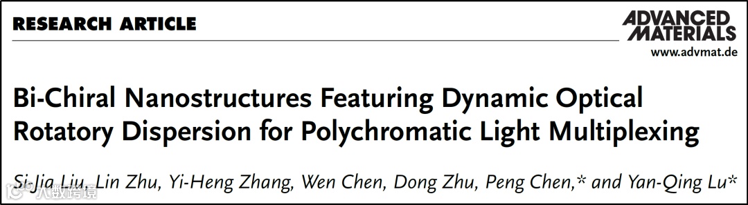 以上研究成果以“Bi-chiral nanostructures featuring dynamic optical rotatory dispersion for polychromatic light multiplexing”为题,发表于《Advanced Materials》,并入选当期Frontispiece卷首插画论文。南京大学博士生刘思嘉、朱琳为共同第一作者,陈鹏副教授、陆延青教授为共同通讯作者。该研究由国家重点研发计划(青年科学家项目)、江苏省前沿引领技术基础研究专项、国家自然科学基金优秀青年科学基金及科技创新2030重大项目等资助完成,同时感谢固体微结构物理国家重点实验室、光智能感控与集成技术教育部重点实验室等平台的支持。