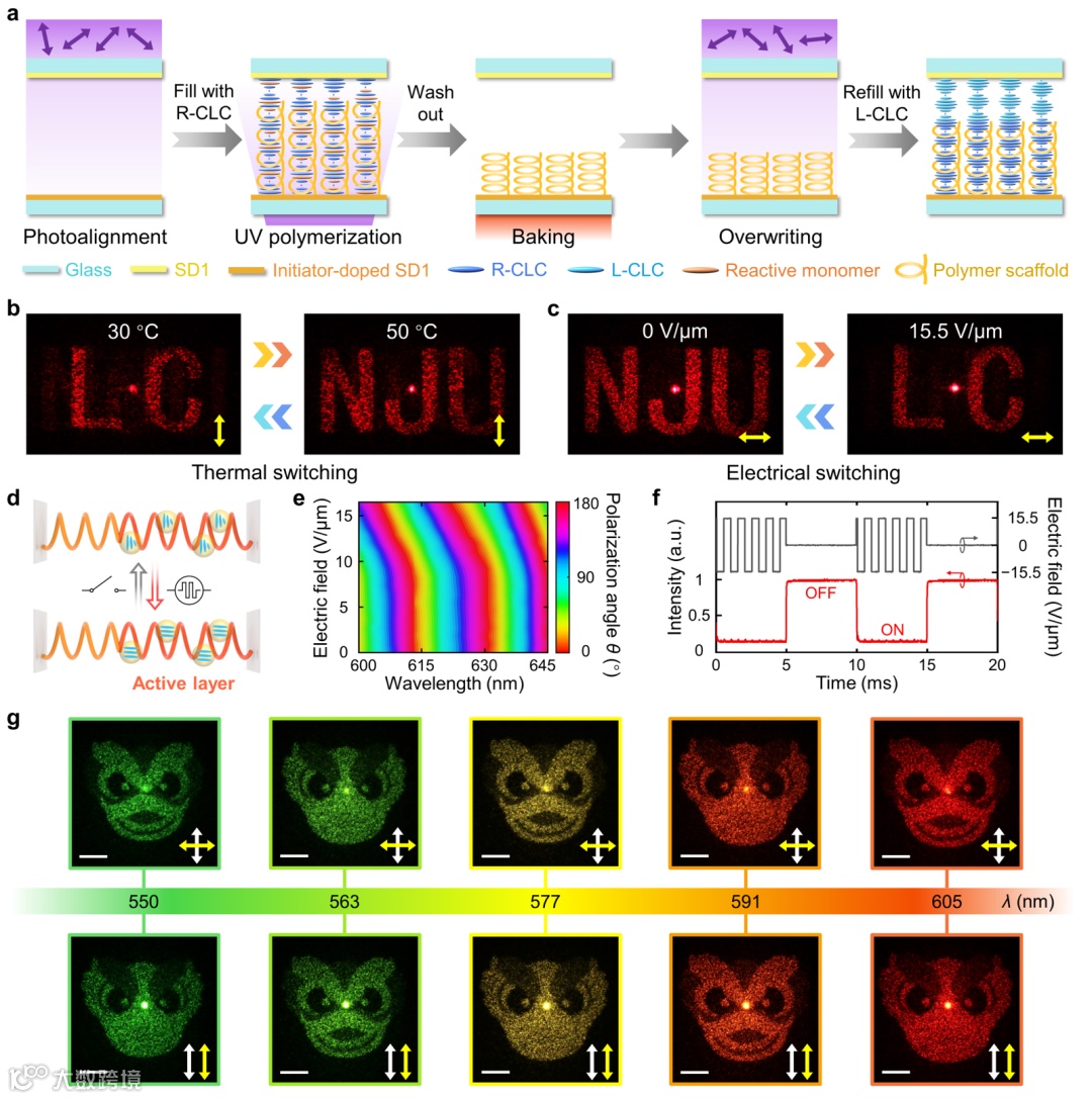 得益于胆甾相液晶丰富的刺激响应性,全息图像在热、电场刺激下能够动态切换(图2b-c)。初始状态下,检偏片清晰地滤出了“LC”(或“NJU”)的图像,而在特定的温度或电场下,反射光场的偏振方向整体旋转90°,于是,检偏片滤出的图像切换为另一线偏振通道的“NJU”(或“LC”)。其中,电调双手性液晶超结构采用了聚合物分散胆甾相液晶作为主动层,响应时间可达36 μs,比普通液晶光学器件快2~3个数量级,为超快多维光场调控提供了新策略。