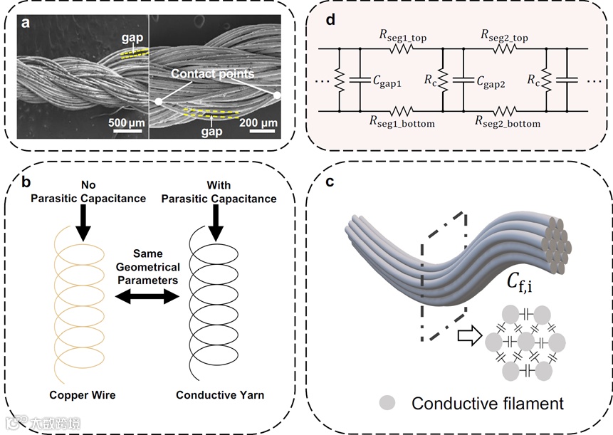 图1. a 一个导电纱线的微观结构,在捻合丝之间形成间隙。b 通过比较两个具有相同几何参数的螺旋电感器的反应性能来估计导电纱线的寄生电容。c 导电纱的横截面:寄生电容均匀分布在导电纱上。d由相邻丝之间的间隙形成的寄生电容的等效电路模型。
