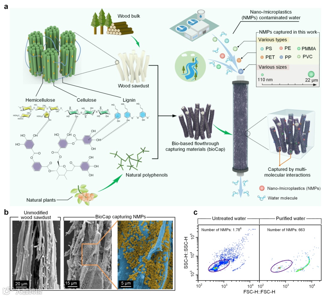 图1. 植物多酚对木屑进行表面修饰及捕获纳米/微米塑料过程的示意图