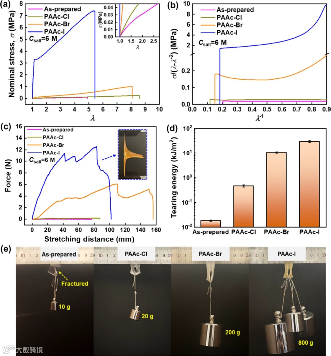 图2. (a) 典型的拉伸行为和 (b) 所制备的和盐掺杂的 PAAc 水凝胶的相应减少应力-伸长图。(c, d) 所制备和盐孵育的 PAAc 水凝胶的力-位移曲线 (c) 和相应的撕裂能 (d),Csalt = 6 M。(e) PAAc 凝胶的光学图像,所制备的凝胶分别承受 10 g 的重量,PAAc-Cl-6 的重量为 20 g,PAAc-Br-6 的重量为 200 g,PAAc-I6 的重量为 800 g。矩形凝胶样品的尺寸均为30 mm×15 mm。