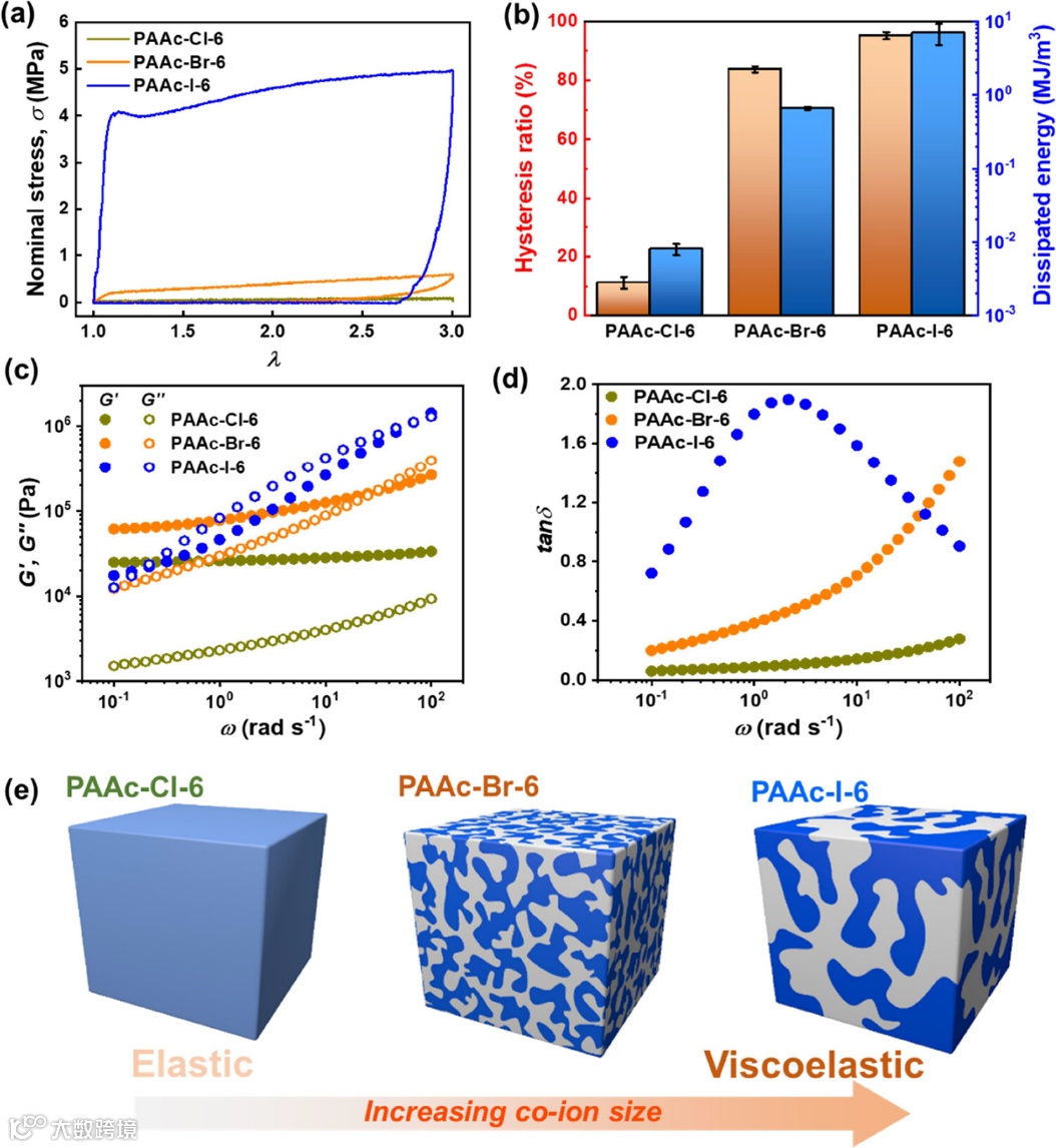 图3. (a) 不同卤化钠掺杂 PAAc 凝胶的加载-卸载曲线 (b) 以及相应的滞后比和耗散能。(c) PAAc-X-6 凝胶的 G'(实心圆)、G''(空心圆)和损耗 tanδ (d) 的频率扫描。(e) 共离子特异性效应诱导 PAAc 凝胶弹性到粘弹性转变的示意图。